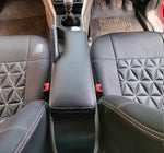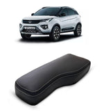 It is made of good quality solid plastic with cushion and covered with eco-leather. Huge storage space beneath the cushion rest. The arm rest aligned to seats can be vertically folded when not required. Arm rest is fitted around the handbrake area of your car and is compatible with your car only if similar plastic area around handbrake.